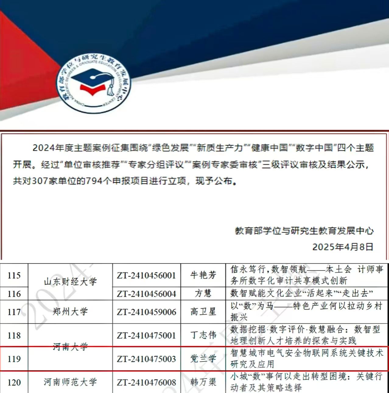 根据教育部学位与研究生教育发展中心发布的《2024 年度主题案例立项结果公示》,我院党兰学教授担任首席专家的案例《智慧城市电气安全物联网系统关键技术研究及应用》 (项目编号:ZT-2410475003)成功立项。该案例团队还包 括乔保军、王春喜、左宪禹、侯彦东和谢毅等 5 位成员