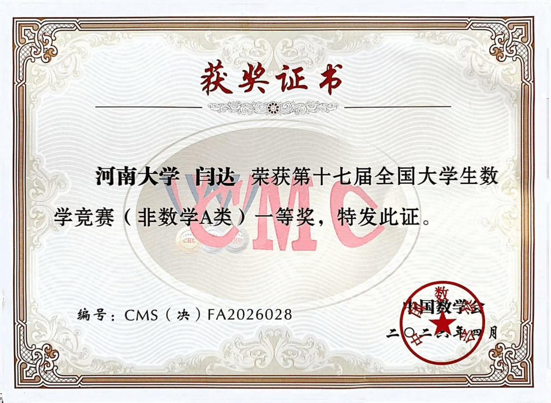 近日,由中国数学会主办、四川大学承办的第十七届全国大学生数学竞赛决赛在成都圆满落幕。我院2023级计算机科学与技术专业本科生闫达同学斩获非数学A类全国一等奖!