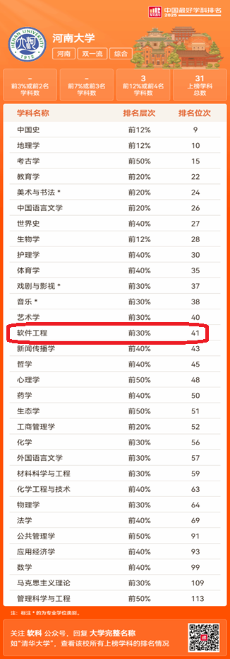 近日,高等教育评价专业机构软科正式发布“2025软科中国最好学科排名”,河南大学共有31个学科上榜,我院软件工程学科排名41位,位列全国前30%。