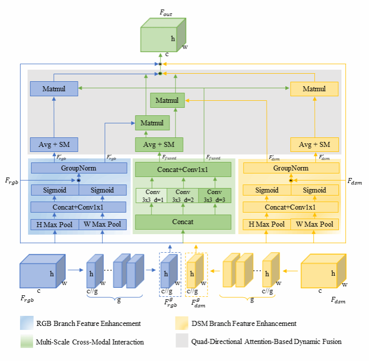 · 第二步:MAFNet实现高精度建筑分割——提出多模态自适应融合网络MAFNet(Multi-modal Adaptive Fusion Network),采用双分支编码器分别提取DOM的纹理光谱特征与DSM的高度几何特征,并通过创新的双模态动态特征融合(DDFF)模块,实现跨模态信息的深度对齐与自适应加权。DDFF模块包含模态内增强、多尺度空洞卷积交互与四向注意力动态融合三个子阶段,以极低的参数量开销显著提升分割精度与鲁棒性,其结构如图2所示。