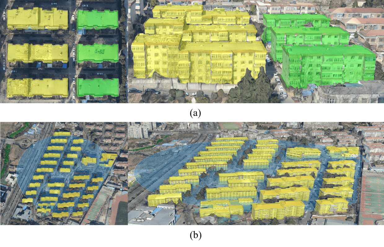 在单体化应用方面,基于MAFNet分割结果,自动单体化流程将建筑轮廓转换为带地理坐标的GeoJSON文件,并加载至WebGL三维平台进行垂直拉伸,与倾斜摄影模型精确叠加,实现了单体建筑的逻辑分割与语义绑定。如图3所示,支持语义信息检索与空间范围查询,为城市管理、规划决策、灾害评估等场景提供了高效方案,且具备大规模城市级应用的可部署性。