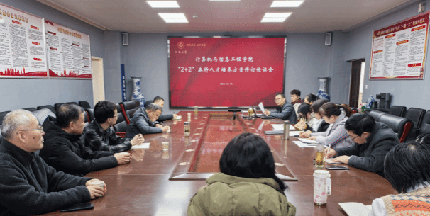 2025年12月25日上午,计算机与信息工程学院在302会议室召开"2+2"本科人才培养方案修订论证会。此次会议落实《河南大学“2+2”本科人才培养方案修订指导意见》,围绕信息科技发展趋势,对标国家战略需求与行业前沿趋势,对本学院新制定的"2+2"人才培养方案修订稿进行系统性研讨与优化。学院领导班子成员、教学指导分委员会委员、教师代表及学生代表近30人参加会议,副院长葛强主持会议。